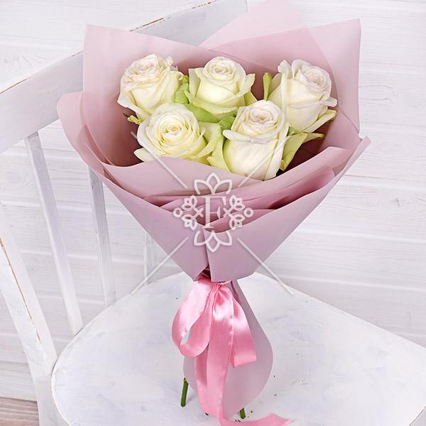 роза белая (кремовая) – 5 шт., упаковка, лента.