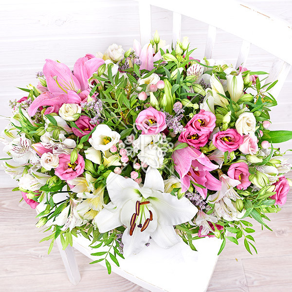 лилия белая и розовая – 2 шт., эустома розовая – 12 шт., эустома белая – 9 шт., гиперикум розовый – 4шт., альстромерия белая – 6 шт., зелень декоративная (фисташка, лимониум фиолетовый), оазис, корзинка.