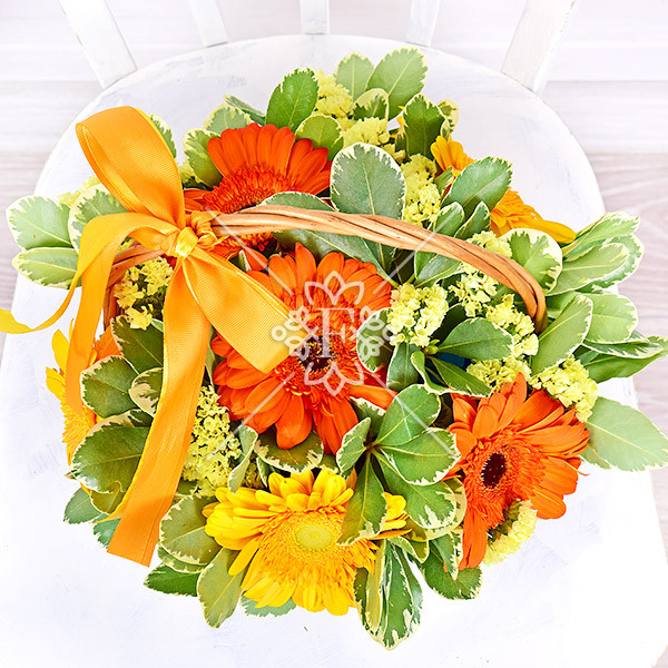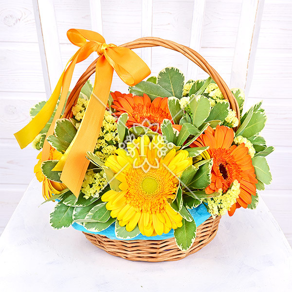 Гербера желтая и оранжевая- 7 шт.,питтоспорум,  статица желтая, оазис, корзинка.