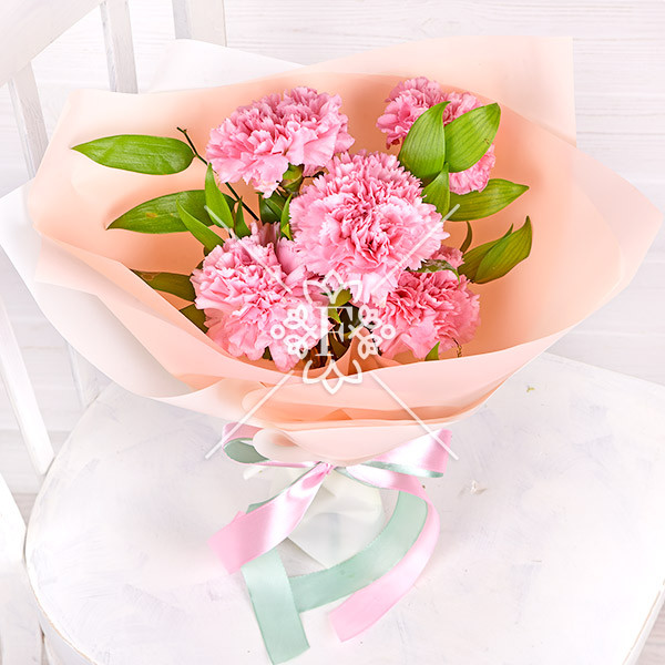 Гвоздика розовая– 5 шт., рускус – 1 шт., упаковка, лента.