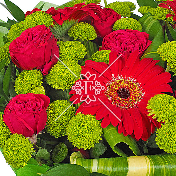 В букете чудесно сочетаются насыщенно алые розы, красные герберы и зеленая кустовая хризантема. Сочетание цветов идеально и очень гармонично! Дополняет композицию и придает ей совершенный вид нежная зелень рускуса, аспридистры и прекрасная упаковка.